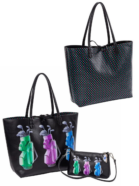 Robuste PVC-Allzwecktasche mit dem “zweiten Gesicht”: Oben offen, mit Schlaufenband zu verknoten. Eleganterseparater Clutch (24 x 4 x 15) mit Karabiner-Trageriemen 60 cm,Polka-Dot Innenfutter, seitliches Einsteck- und Reißverschlußfach.