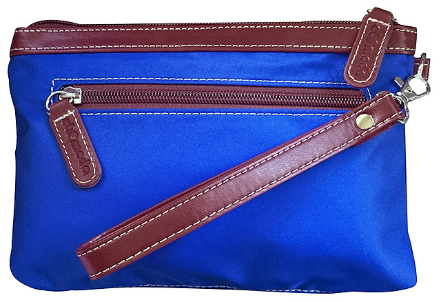 Vielseitiger "Allrounder" mit Karabiner-Handschlaufe - seitliches Reißverschlussfach außen und innen - Innenfutter schwarz. 22 x 16 cm.